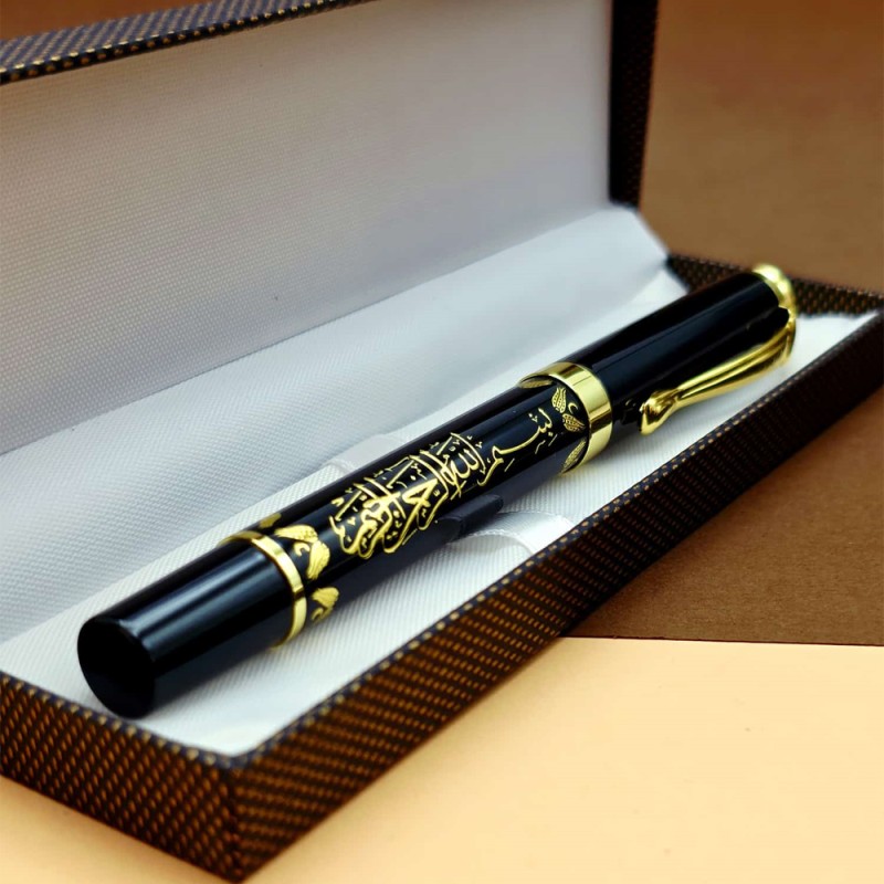 Metal altın yaldızlı besmele kabartmalı kalem özel tasarım kalem kutusunda şık bir görünüme sahip olmuştur.